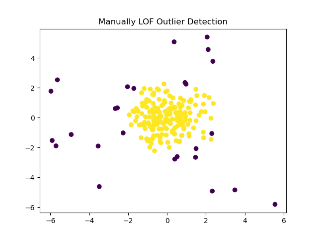 plt.scatter(X[:, 0], X[:, 1], c=labels) plt.title("Manually LOF Outlier Detection") plt.show()